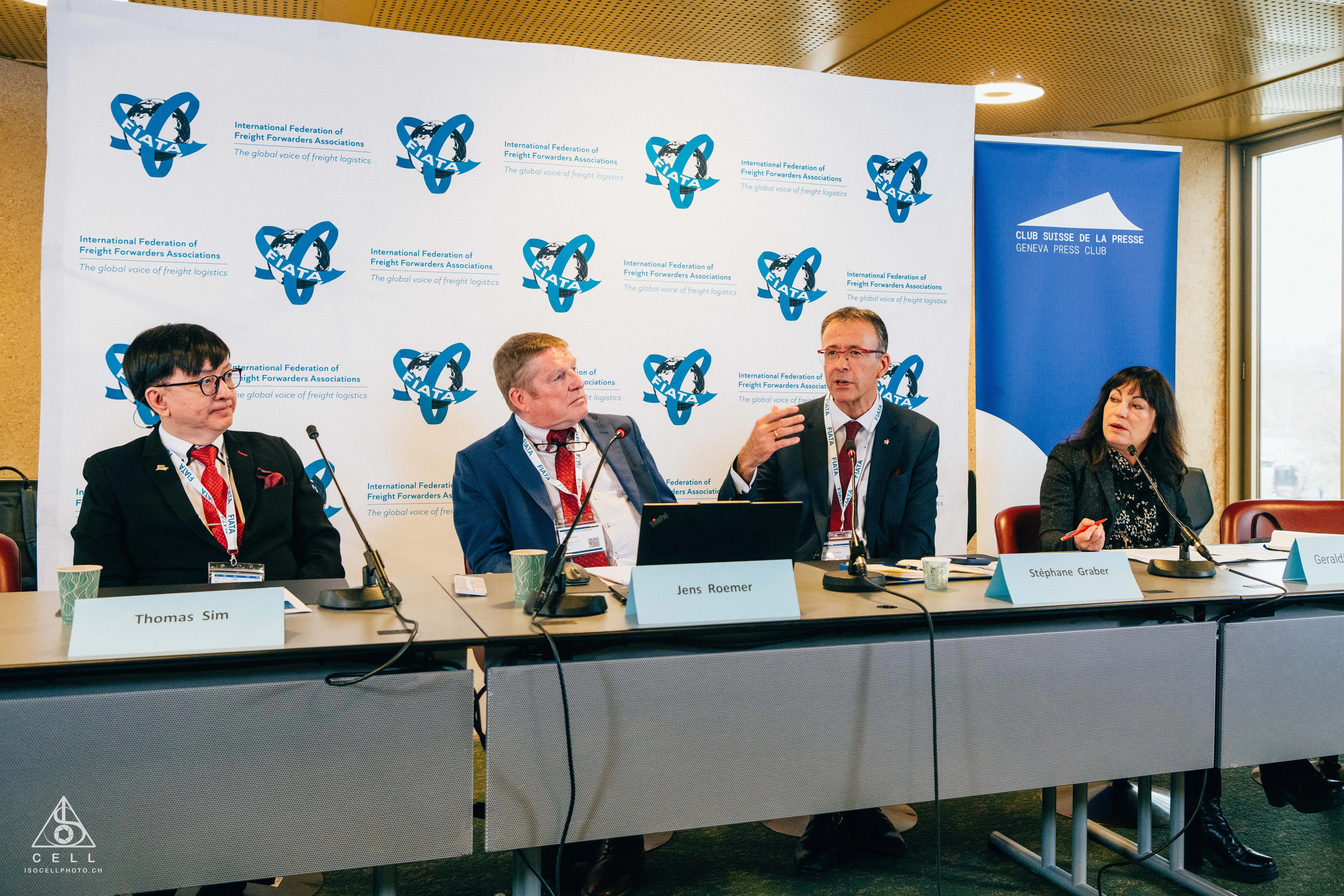 From left to right: Prof Dr Thomas Sim, FIATA President; Mr Jens Roemer, FIATA Senior Vice-President; Dr Stéphane Graber, FIATA Director General; and Ms Géraldine Savary, Executive Director of the Swiss Press Club.