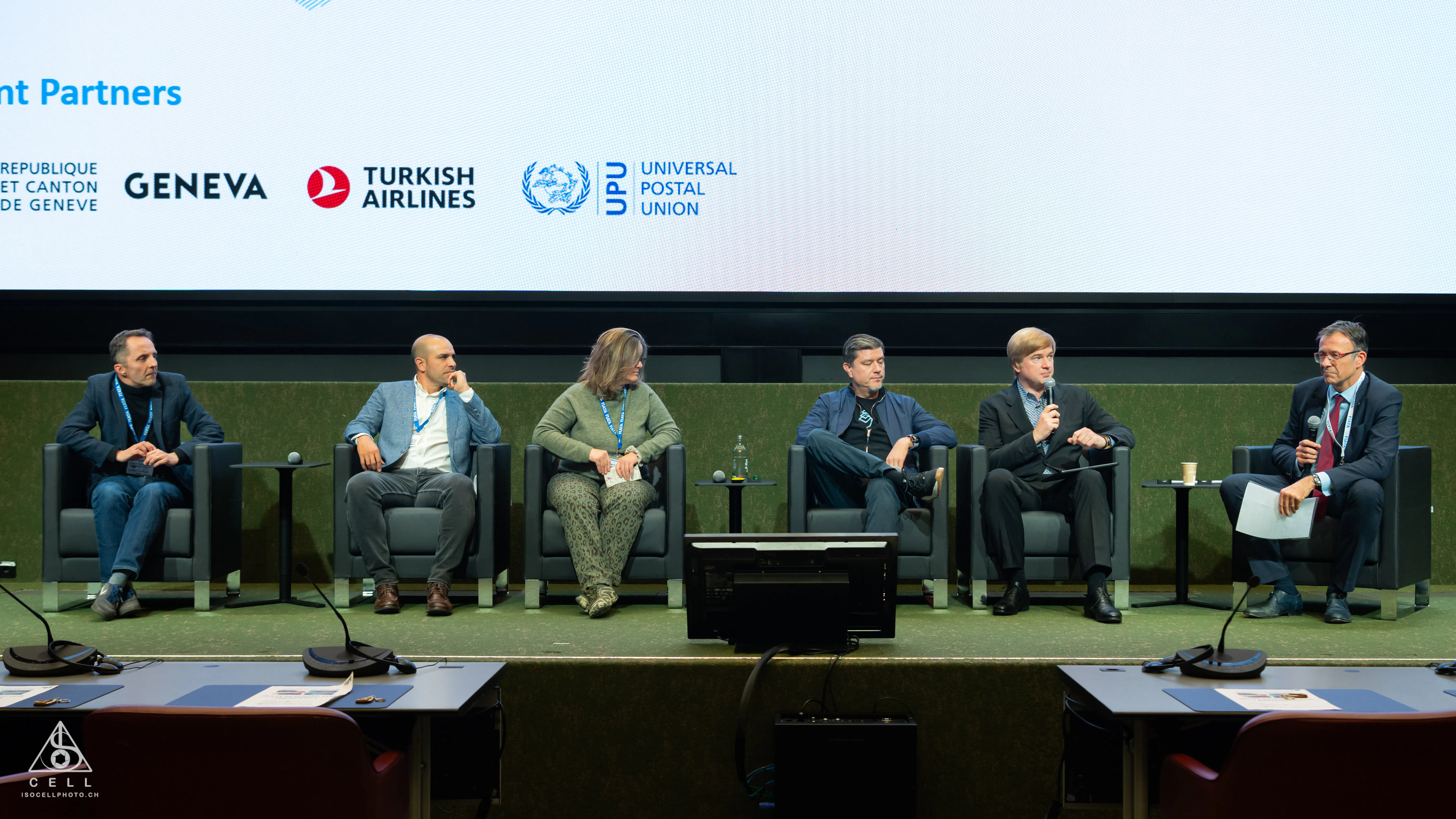 From left to right: Mr Pierre-Antoine Champin, Principal Data Strategist at the World Wide Web Consortium (W3C); Mr Julio Cantú, Co-Founder and CEO of ADUANAPP; Ms Carolynn Bernier, Computer Engineer and Researcher at the French Alternative Energies and Atomic Energy Commission (CEA); Mr Yann Barbarroux, CEO and Founder of Otonomi; Mr Vitaly Smilianets, Founder and CEO of AWERY Aviation Software; and Dr Stéphane Graber, FIATA Director General.